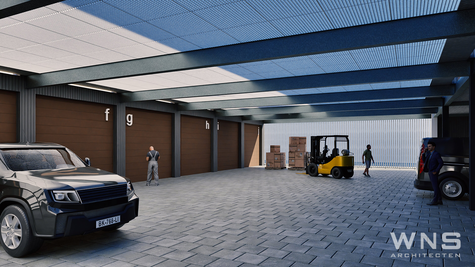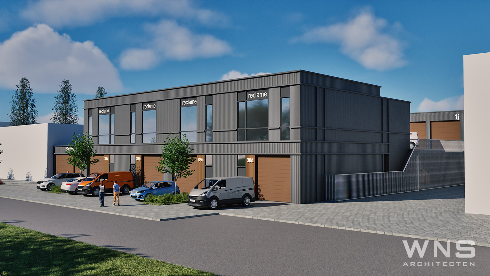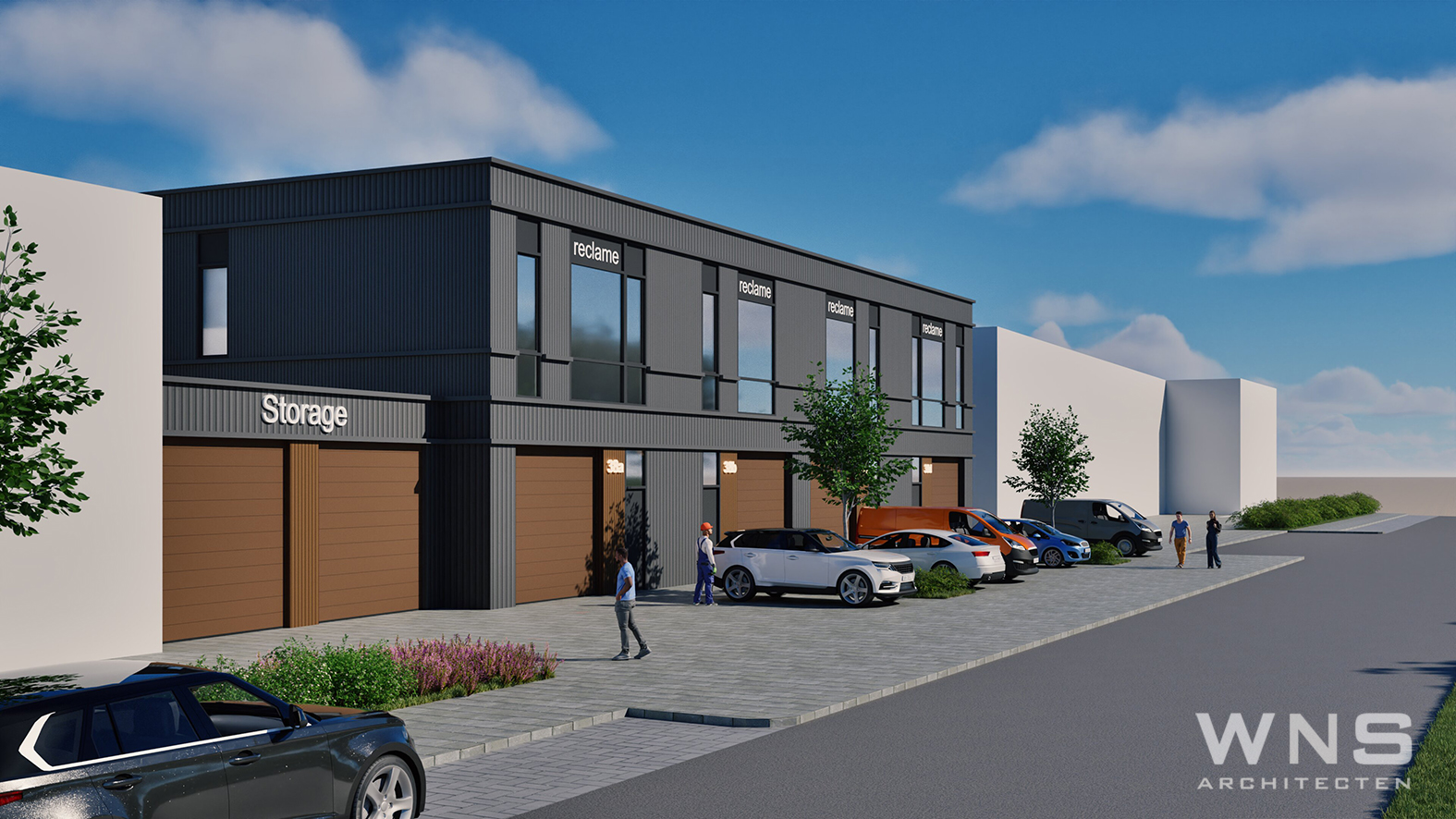 Architectonisch ontwerp van 4 bedrijfsruimtes, gecombineerd met garage- en opslag units in 2 bouwlagen.